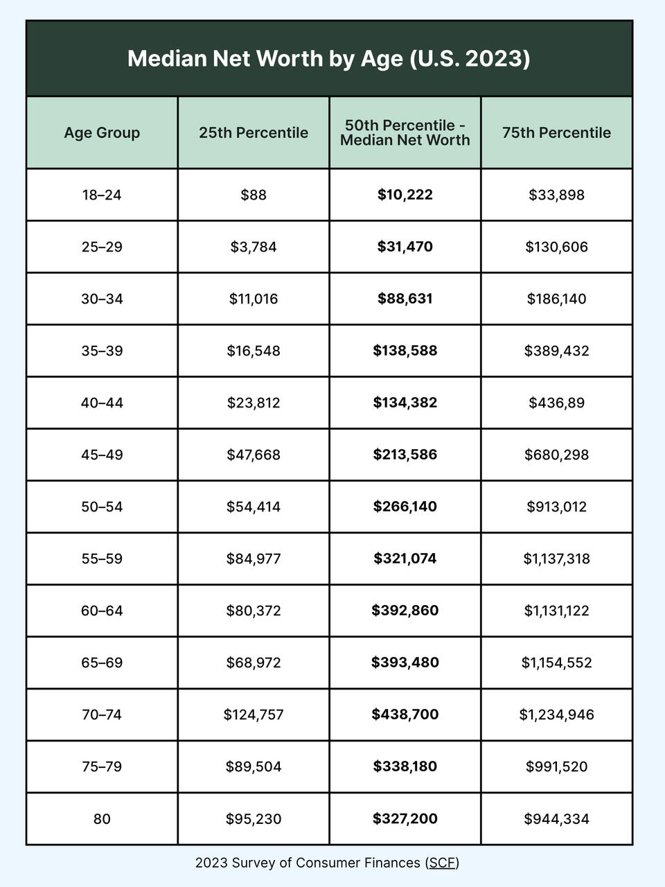 This chart shows the 25th, 50th, and 75th percentile of household net worth by age group in the U.S.Find your age bracket and see where you stand.Knowing your position helps you set realistic goals and build a plan to move up the ladder.